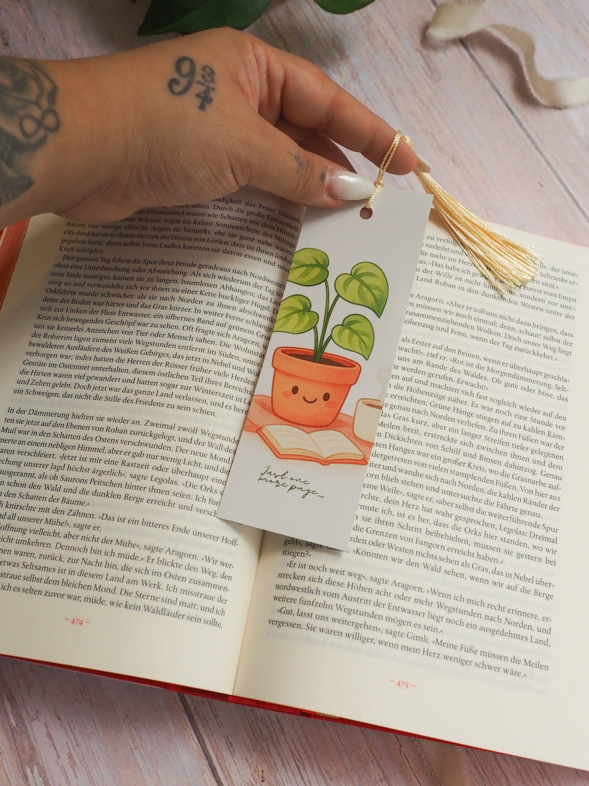 Das Lesezeichen hat ein kleines Loch am oberen Rand, durch das eine hochwertige Quaste gezogen ist für ein haptisches Extra und noch mehr Pflanzenflair auf jeder Seite.